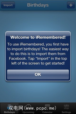 手动输入所有朋友生日会花费很长时间,因此该应用程序使您能够从Facebook或联系人中导入生日。这样可以节省大量时间,而不是一次输入每个生日。在屏幕的左上方,您将看到一个标记为“ 导入"的按钮。单击该按钮,应用程序将为您提供从两个位置之一导入的选项。