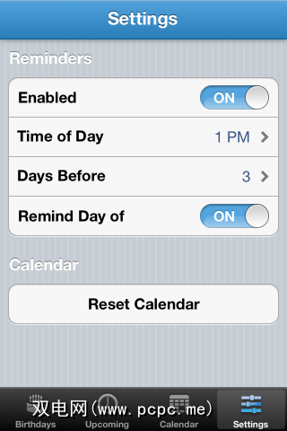 该应用程序将发出警报您即将到来的生日。您可以通过设置屏幕选择应用程序何时提醒您。您可以选择应用的某个时间提醒您,以及应用应该在生日前通知您多少天。您可以告诉应用在生日前1到10天的任何时间提醒您。您还可以选择该应用是否在实际生日那天再次提醒您。