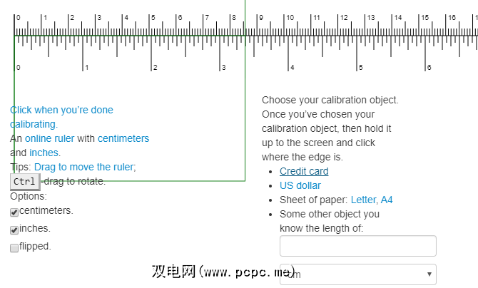 FreeOnlineRuler也具有校准工具。点击屏幕底部的请校准标尺(如果您之前已经打开过,请校准)以将其打开。在这里,您可以选择测量信用卡,美元钞票或纸来校准标尺。