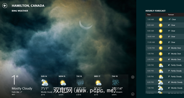 此外,Weather是胜任的天气应用程序,它依赖Bing Weather,并汇总了The Weather Channel,AccuWeather,WeatherTrends360等提供的天气信息。它包括从每日和每小时的天气预报到各种地图和历史天气图的所有内容。为了使信息更方便,请将应用程序放在您最关心的位置,这将显示在“开始"屏幕的Weather实时图块上。