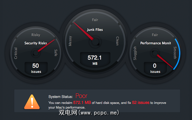 在标有“系统状态"的屏幕上,您将看到安全风险,垃圾文件和性能监视器。单击屏幕底部的“扫描"按钮将启动对这三个部分的扫描,然后提供一些加快处理速度的方法。 MacBooster 2可以让您选择从驱动器中删除不需要的文件,修复权限,释放RAM,检查恶意软件以及进行许多其他测试。完成后,系统会提示您采取措施来解决问题。
