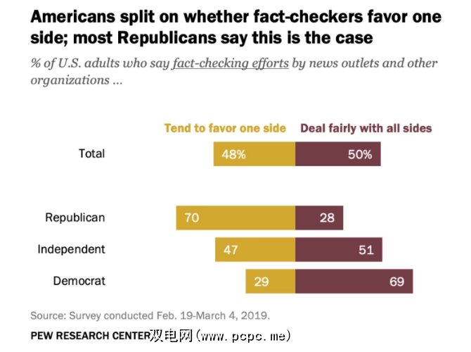 您认为事实检查存在偏见,是自由派还是保守派取决于您的政治立场。多项研究表明,共和党的支持者和倾向共和党的独立人士对包括Snopes在内的任何事实核查场所都持强烈不信任感。鉴于民主党和有民主党倾向的独立人士更可能信任一个事实检查站点。