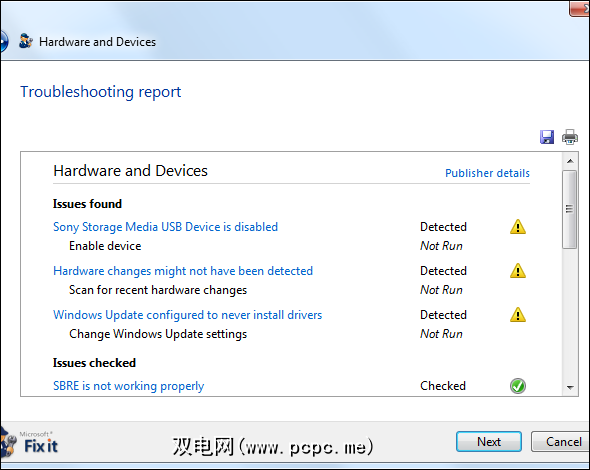 我们为Fix It服务提供了另一次机会,可以通过运行“硬件设备不起作用或Windows中未检测到"修复它。此Fix It确实找到了问题。