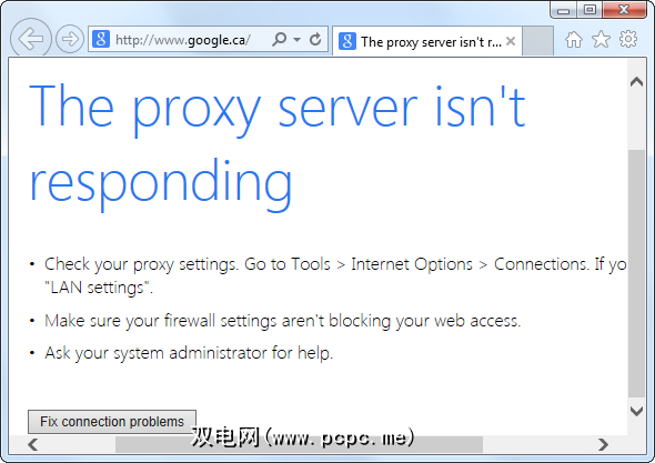 Fix It服务没有甚至使其通过无效的代理服务器,无法连接到网络,也无法解决问题。但是,Internet Explorer值得一提的是,它注意到代理服务器本身无效,并建议我们将其禁用。