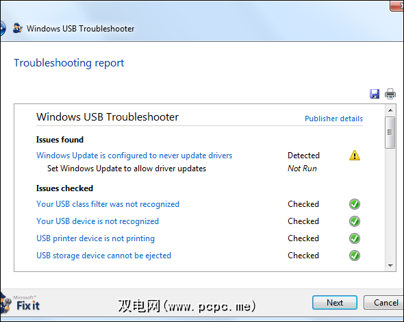 之后,我们运行“自动诊断并修复Windows USB问题",并在插入USB驱动器的情况下修复它。此修复程序没有发现问题,仅建议我们使用Windows Update安装USB驱动程序。
