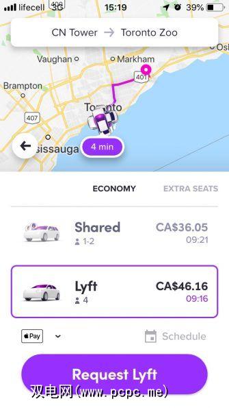 Lyft在加拿大的普及程度不如在美国,但在主要城市与Uber竞争。例如,在多伦多,从CN塔到多伦多动物园的旅程,使用UberX的费用为 49.44加元,使用Lyft Economy的费用为 46.16加元,这使Lyft成为了更实惠的选择。