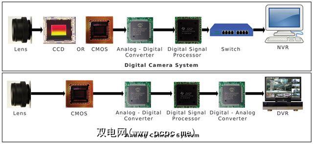 每种类型的相机有一个镜头捕捉光线并聚焦。每个传感器都有某种类型的光传感器,可以将光转换为模拟电子信号。它们都还具有模数转换器。从那里,数字信号被发送到数字信号处理器(DSP)。在两种类型的相机中都会发生这种情况。此时,数码相机现在将信号发送到NVR。