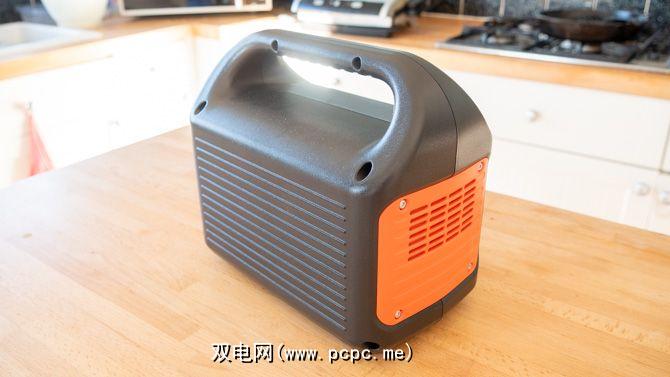 设备本身相当坚固,黑色和橙色的ABS坚固外壳在顶部配有有用的提手。尺寸为5.2 x 9 x 7.7英寸,所有端口和LCD显示屏都位于一侧。即使未插任何电源,也可以短暂激活显示屏,以一目了然地检查电池剩余电量的百分比。