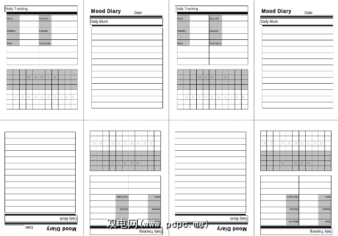 任何人都可以使用打印机中使用的标准A4或Letter尺寸的纸张来构建Pocketmod。它变成了一个八面的迷你小册子,小得足以装进钱包。而且您可以立即制作任意数量的这些。默认情况下,您甚至可以将空白的Pocketmod用作日记,从而释放您的空间来使用所需的空间。在主要部分中添加您的想法,同时您可以在指定的位置跟踪心情,天气,睡眠时间,运动,药物和食物摄入量。此外,被诊断出患有抑郁症或焦虑症的人也可以追踪他们的情绪。