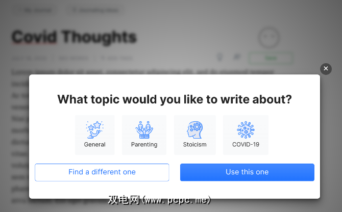 该应用提供了四种不同的提示类别:常规,育儿,坚忍和COVID-19 。单击任意以生成一个问题,您可以将其作为日记来回答。即使您不想使用Perspectiva应用进行日志记录,也可以使用免费的Perspectiva Covid Prompts微型应用和新闻通讯来获取提示。然后,您可以使用这些提示在自己的日记应用程序中编写。