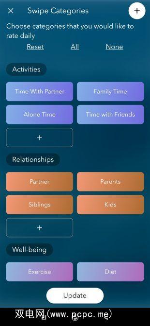 最初设置“滑动日记"时,请在多个类别和要跟踪的卡片之间进行选择。类别包括工作,学校,人际关系,福祉,财务和自我发展。每个类别都有多个可跟踪的卡片,您也可以添加自定义卡片或类别。