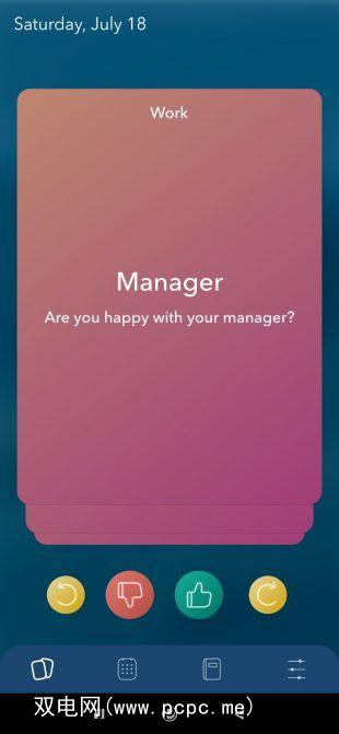 选择后,Swipe Journal就像是用于记录日志的Tinder。您会看到一张卡片是一个问题,答案是竖起大拇指,竖起大拇指或下一张/较早的卡片。遍历整个场景,每天记录和跟踪您的体验。您可以随时进入统计信息,以查看您对这些单个主题的看法已经很长时间了。