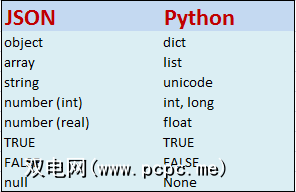 print type(obj["firstName"]), type(obj["lastName"]), type(obj["age"])# prints<type 'unicode'> <type 'unicode'> <type 'int'>以下转换表用于将JSON转换为python。