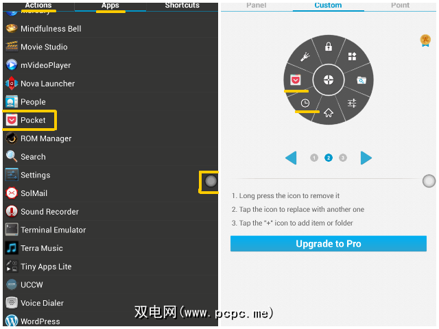 我最喜欢Floating Toucher的是,即使在免费版本中,我也可以替换默认面板自定义应用程序。从下面的屏幕快照中可以看到,在主应用程序设置屏幕上,我能够添加到最新应用程序和Pocket的链接,从而替换了默认的浏览器和更清洁的应用程序。