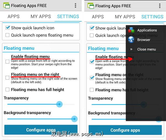 从通知栏中访问应用程序,隐藏快速启动图标,更改应用透明度,以及配置应用以使其显示在浮动菜单中,是您可以在此屏幕上进行的其他一些调整。