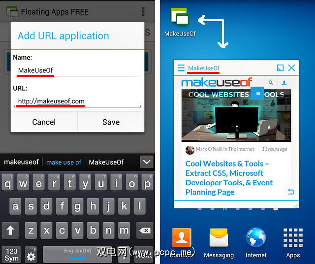 从我的应用程序部分将任何URL转换为浮动应用程序。在下面的屏幕截图中,您可以看到我如何使用此功能为PCPC.me创建浮动应用程序,甚至向主屏幕添加了快捷方式。现在,在使用任何应用程序的过程中,我可以跳至PCPC.me网站以快速查看一些最新帖子。