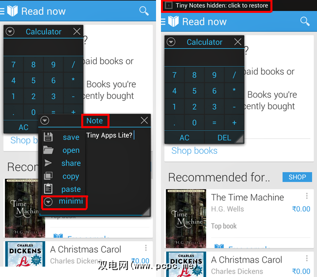 如果您正在寻找小部件特定的选项,例如记事本的复制/粘贴,或绘画小部件的颜色选择器,您可以通过点击小部件界面左上方的箭头图标来找到它们。请记住,这些小部件虽然非常有用,却会占用屏幕空间,如果您一开始使用的是小型设备,则可能会遇到问题。有一个简单的解决方法。在小部件菜单中点击 minimi ,将小部件藏在通知面板中,直到下次需要它为止。问题已解决!