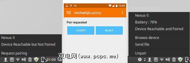KDE是唯一支持与系统通知完全交互的桌面环境(DE),根据我的测试,因此通知中的“接受/拒绝"选项仅可在KDE中使用。非KDE用户需要从桌面指示器/小程序而不是Android应用程序请求配对。