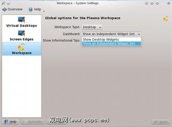 在“系统设置"中启用默认禁用设置时,活动最有用。在虚拟桌面的“工作空间行为"类别下,您需要启用“ 每个桌面的不同小部件"。请注意,当您点击 Apply 时,您的桌面实际上是“重置"的,尽管如果禁用该设置并再次点击 Apply 也会返回桌面。