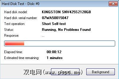第一个测试是简短的自检。在120GB SSD上,此过程仅需不到一分钟的时间,并检查驱动器的主要组件是否正常工作。这是一项非破坏性测试,不会更改磁盘上存储的任何数据。