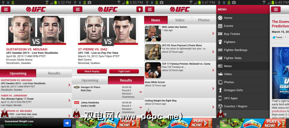 极简设计是此应用程序的关键,因为UFC确实希望您将其用作按次付费观看比赛的迷你电视。尚不清楚您是否在Android手机上购买了活动,但该活动仅适用于Android手机或电视。例如,最近的UFC 158与乔治·圣皮埃尔(Georges St. Pierre)与尼克·迪亚兹(Nick Diaz)的比赛费用为50美元。我为什么要付那么多钱才能在手机屏幕上观看它?我不知道。但是该应用确实具有值得下载的功能,是“新闻"部分。该更新的速度几乎与战斗结束时一样快,因此您至少要在哥们打来电话之前就知道并为您宠坏它。