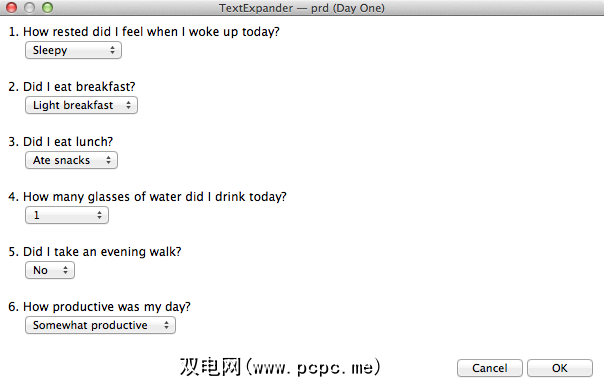 我开始使用的一种方法至少是每天发布的一个日记条目使用TextExpander [不再可用]代码段表单。它由六个问题组成,每个问题我都可以选择多个答案,并将结果粘贴到“第一天"期刊中。我不是每天都使用这种表格,但是当我这样做时,有时会导致我写关于我的日子及其进展的反思日记。
