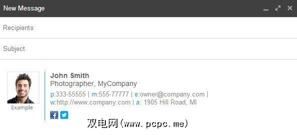或者,如果您想要更多有趣的东西,可以使用Wisestamp。蒂娜(Tina)首次使用Wisestamp电子邮件签名。如下所示,它为您提供了格式精美的签名,带有社交媒体徽标,以及您自己的面部照片。