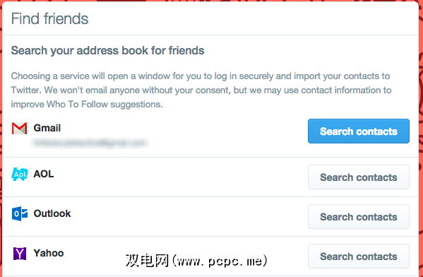 在Twitter上,只需转到此处并确定要登录的电子邮件即可。密码部分将由身份验证令牌完成,因此Twitter将永远不会看到您的密码。然后它将扫描您的地址簿,以查看您的任何联系人当前是否在Twitter上。如果是这样,您将看到一个列表,并询问您要关注的列表。