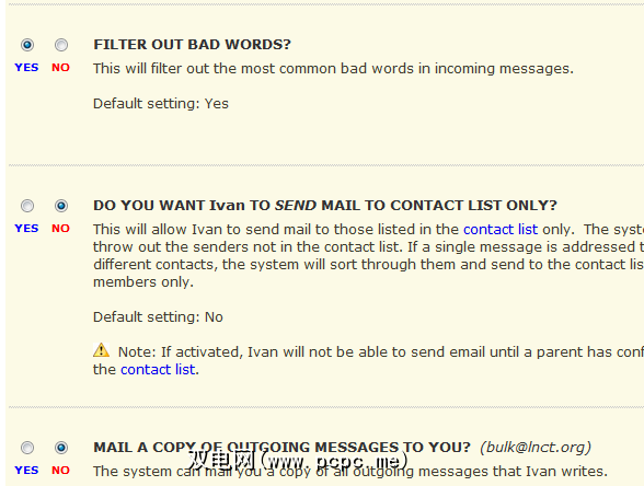 To start, create a parent’s account on kidsemail.org. You can then add children accounts, each tailored exactly to the child’s needs. For starters, you can choose between the regular interface, suitable for younger kids, and a more mature interface for older kids. You then have a long list of security settings you can configure, giving you the exact amount of control you need for each child. For example, you can set it up so a child can send or receive emails only to and from the approved contact list. You can get copies of both sent and received emails, if you wish. You can choose whether emails include links and attachments, and which kinds of attachments, and even filter out bad words from the emails your children receive.
