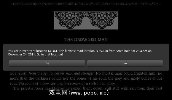 Amazon WhisperSync运行得很好,并且Kindle Fire通常会同步到我最后一页我已经读过这本书了。阅读应用程序界面如下所示: