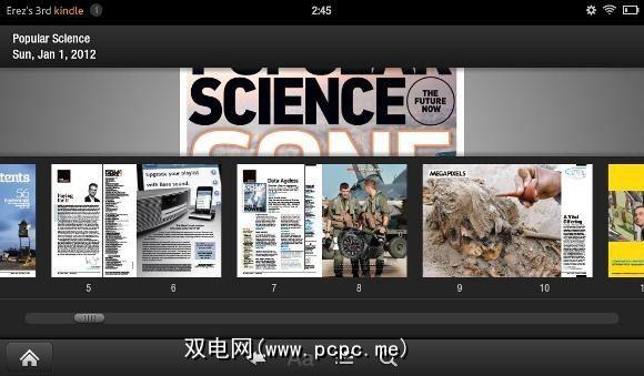 这是2012年1月发行的Popular科学(您可以在Kindle商店中在国际上购买杂志)。底部有一条条,可快速擦洗杂志。价差看起来像这样: