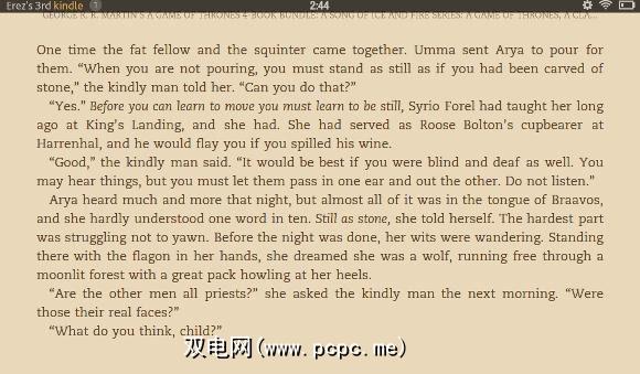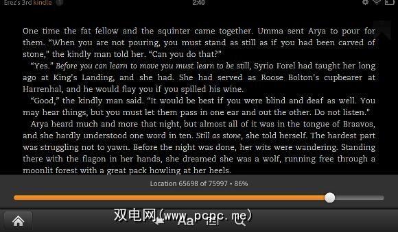 这是横向模式。该应用程序实际上与Kindle Android应用程序相同,不同之处在于控件位于底部,因为Kindle Fire没有“菜单"硬件按钮。点击屏幕的右侧可翻到下一页,点击屏幕的左侧可翻到上一页。从理论上讲,这很好,但是在握住设备时很容易错误地敲击屏幕边缘。点击屏幕中间会弹出控制界面,您可以在上面的屏幕截图中看到。当您刚阅读时,该应用程序将如下所示: