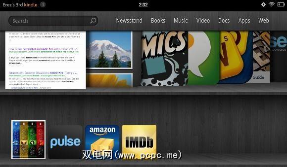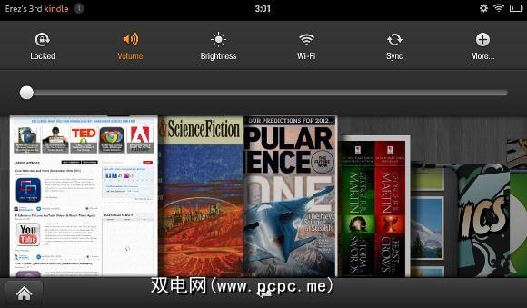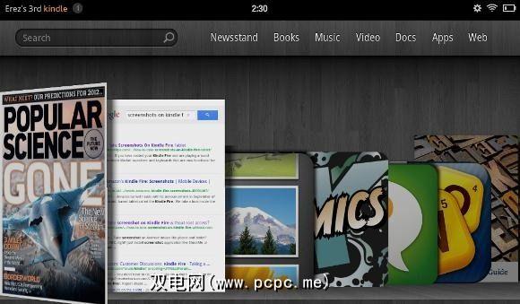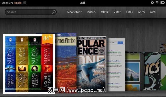 这是Kindle的主要功能界面看起来像是横向。最顶部是经过大量修改的Android状态栏。设备的正下方是该设备可以显示的内容类型列表,并且该列表下方是您最近查看的项目的显示。您可以在类似CoverFlow的显示屏中在它们之间滑动:
