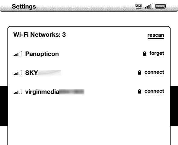 要处理无线连接问题,请先检查信号强度。在所有型号的显示器的右上角都可以找到该名称,并且还会指示您的连接类型。如果信号较强但无法访问Kindle Store或您的书架,请尝试通过打开菜单>设置> Wi-Fi设置(在以后的型号上为 Wi-Fi网络)断开连接)并访问其他网络。您可能会发现重新启动设备会有所帮助(请参阅下文)。