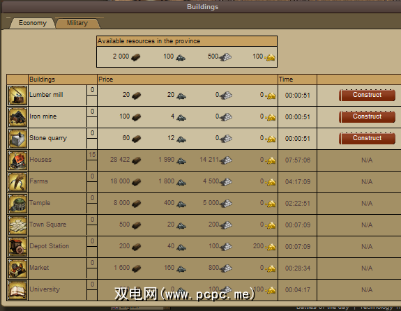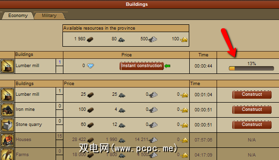 您需要立即做的第一件事就是建立资源。您可以通过单击位于新村庄中间的市政厅来建造建筑物。完成后,您会看到所有可建造的建筑物(如果它们未显示为灰色)。首先,您要建造木材厂,铁矿和采石场。
