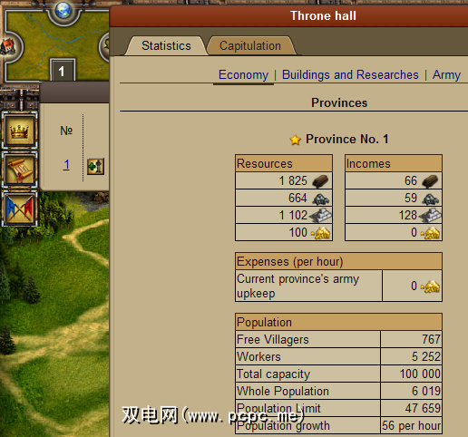 在左侧,您会看到三个图标,可在其中获取当前的统计信息和有关您的信息进展。王座大厅将显示您的总人口,支出,收入和总资源。