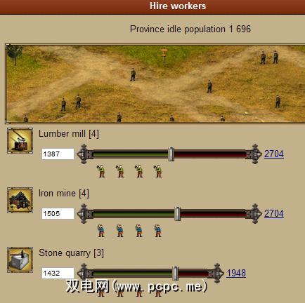 随着人口的增长,您会看到农民站在村子里。那些是闲人!单击他们可以使用的建筑物之一,使他们能够工作,然后将滑块向右移动以增加那里的工人数量。