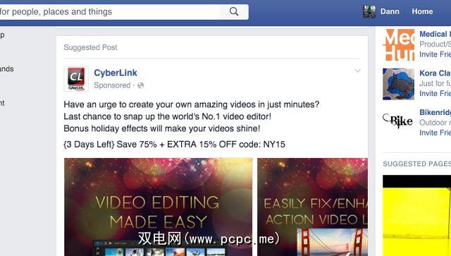 本地广告也越来越多地出现在社交媒体上,它们看起来像是您喜欢或关注的公司的帖子,例如CyberLink在我的Facebook提要中的这一帖子: