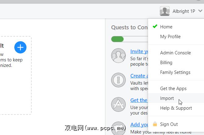 将您的站点信息导入1Password非常简单。设置好帐户后,点击右上角的1Password帐户名称,然后选择导入。