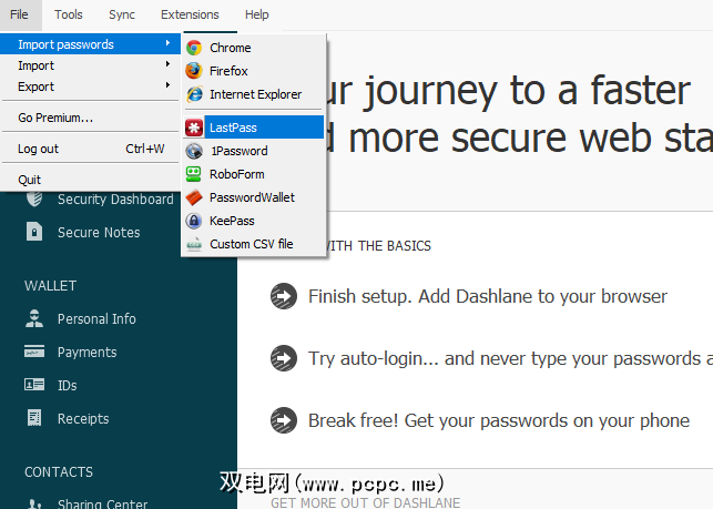 要开始使用,请打开Dashlane应用程序,然后单击文件>导入。密码> LastPass 。
