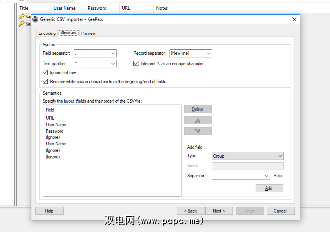 在LastPass导入中,KeePass已标识了两个“用户名"字段。这是不对的,因此我们需要对其进行修复。回到结构窗格。