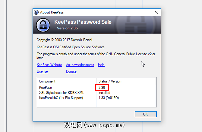 首先,请确保您使用的是KeePass桌面应用程序的第2版。转到帮助>关于KeePass…,并确保版本号以2开头。