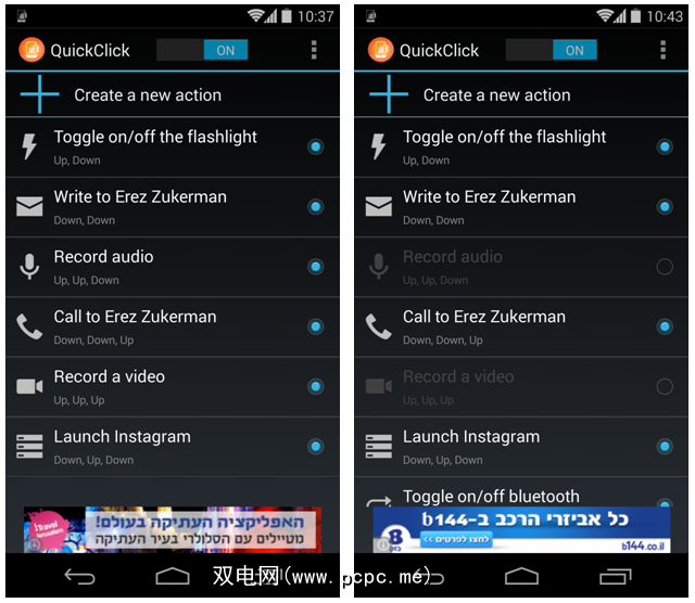 就是这样,您现在就可以使用新动作了。您可以继续向QuickClick添加越来越多的操作,但是请记住,添加的次数越多,按钮序列将变得越复杂。在某些时候,这些可能会变得难以记住。如果您不需要一直执行所有操作,则可以设置它们并将其停用。然后,您可以在需要它们时轻按一下以重新激活它们(请注意下面的右侧屏幕快照中的禁用操作):