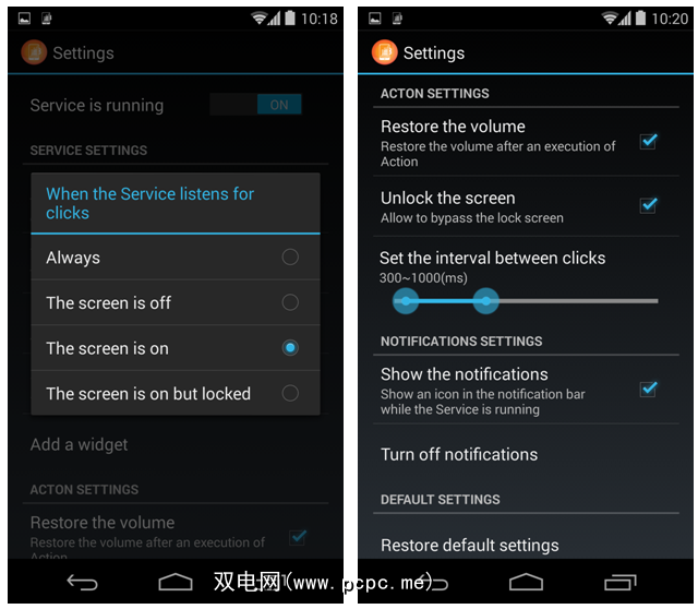 从设置中,您还可以控制两次单击之间的间隔,无论操作是否可以绕过手机的操作,锁定屏幕,应用程序的通知栏图标等。请注意,如果您将应用程序设置为绕过锁定屏幕,它甚至会绕过您的PIN码!这可能是一个主要的安全漏洞,只需按几下按钮,任何人都可以访问您的短信。