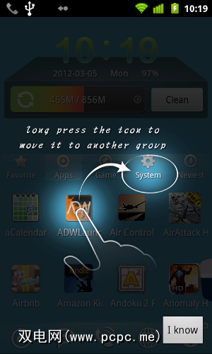 总而言之,这是这里的两个主要区别。小部件和应用程序图标以及内置应用程序组的单独区域。应用分组是一项非常需要的功能,而且似乎还会添加一些新启动器(我们已经在另一个新启动器Sweeter Home上研究了复杂的分组功能)。由于其他启动器没有此功能,因此Hi Launcher提供了帮助手(或实际上是手指)来帮助您对应用程序进行分类:
