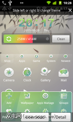 以上是“组管理"界面,代表一个我看到的Hi Launcher和其他启动器–组之间的两个主要区别。另一个不同之处是创新的拆分式主屏幕设置,它具有独立的可滚动区域,我非常喜欢。在与Go Launcher圆滑的外观相匹配之前,主题还有很长的路要走,而且动画肯定可以加速。
