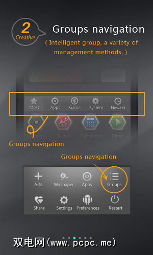 首次启动Hi Launcher时,它将带您快速浏览六个步骤,以演示文稿的形式进行演示。上面的幻灯片值得注意,因为它引入了“组"功能,这是Hi Launcher体验中最独特,最有用的方面之一。现在,让我们看一下发射器本身: