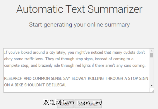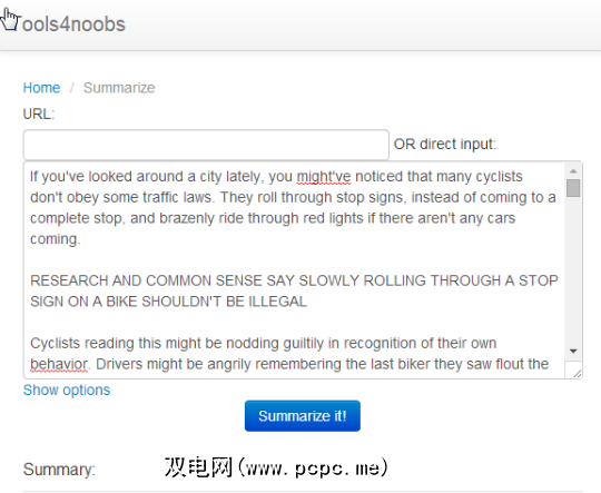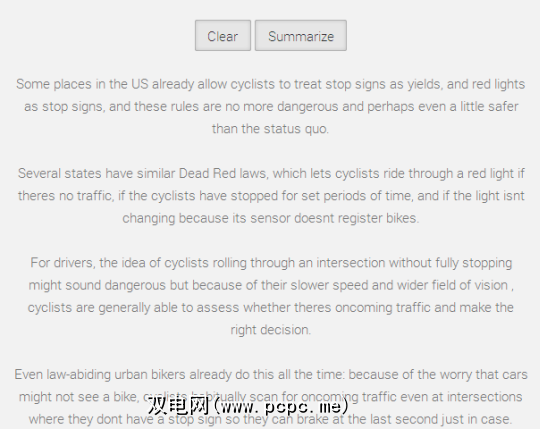 我通过总结Vox的1700篇文章对每个在线摘要器工具进行了测试争论为什么骑自行车的人应该能够翻过停车标志并穿过红灯(爱达荷州停车站( aka ))。我之所以选择这篇文章,是因为它结构性强,提出了论据,不是技术性的,并且有可能影响许多国家(例如PCPC.me的国际受众)的人们的日常生活。