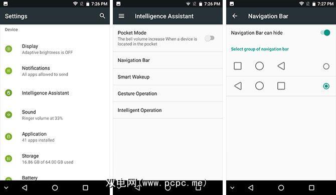 在此菜单中,您可以打开或关闭一些小技巧。当设备放在口袋中时,“口袋模式"会自动提高音量。您可以在导航栏上重新排列“后退"和“最近"键。而且,您可以切换隐藏导航栏的功能(这是我在其他版本的Android中所没有的功能)。