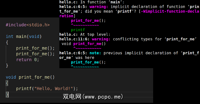 原型是初学者C与其他语言不同的主要方式之一。简而言之,原型就像是稍后定义的功能的预览。如果在主函数之后编写print_for_me()函数,则在编译时可能会收到警告: